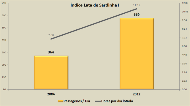 Em 2012, mesmo com a alteração na lei que rege o limite de passageiros nos ônibus comuns, passando de 65 para 75 o limite de passageiros, cada ônibus pode ficar circulando lotado por mais de onze horas, um aumento de 60% no índice “Lata de Sardinha”, reduzindo drasticamente a possibilidade de um cidadão encontrar um ônibus que não esteja lotado, com tarifa majorada acima da inflação, extrapolando os lucros dos donos do sistema de transporte.